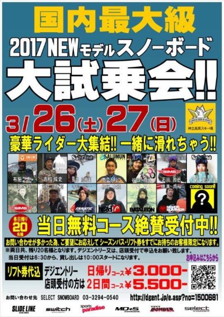 当日はプロライダーと一緒に滑れちゃう、試乗会に参加予定です! (一緒に試乗会参加される方は→http://dgent.jp/e.asp?no=1500681 早割有で参加する方は→http://dgent.jp/e.asp?no=1600219) ■スケジュール 日帰り。 自宅を早朝(4時ごろ)出発。 〜都内各所でピック、7時頃ゲレンデ着 〜上がりは15時から17時くらい〜夜ご飯と温泉寄らずに直帰です。 ■行き先(ゲレンデ、方面) 神立高原スキー場 ■出発地〜経由地 荒川区→練馬IC→神立高原 *ピックアップのし易さを重視させてもらいます。 また、家まで来られる方