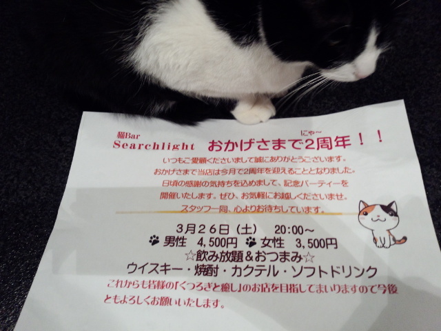 【猫bar Searchlight おかげさまで2周年!!】 いつもご愛顧くださいまして誠にありがとうございます。 おかげさまで当店は今月で2種年を迎えることとなりました。 日頃の感謝の気持ちを込めまして、記念パーティを 開催いたします。是非お気軽にお越しくださいませ。 スタッフ一同心よりお待ちしております。 (日時)3月26日㈯ 20:00~ (料金)男性:4500円 女性:3500円で ☆飲み放題とおつまみ☆ ウイスキー・焼酎・カクテル・ソフトドリンク… (以下 管理人より) 参加表明することが条件ではありません