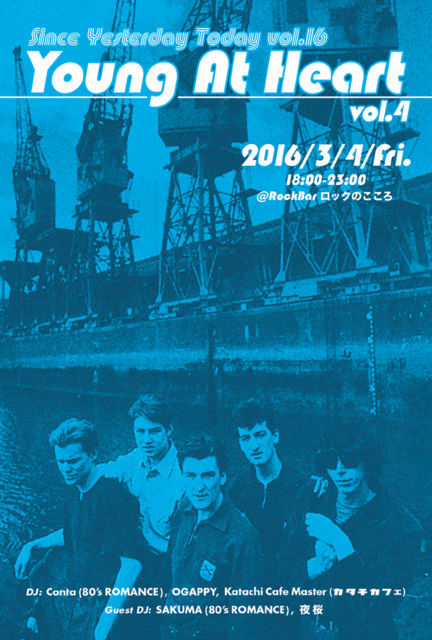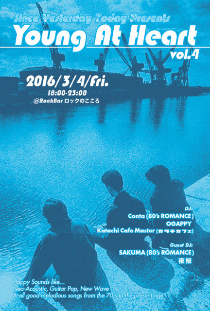 告知を失礼いたします。 SYTvol.16 ★Young At Heart vol.4★ ◆3月4日(金) ◆18:00〜23:00 ◆@渋谷BAR『ロックのこころ』 http://www.rocknococoro.com/home.html ◆DJ: Conta (80's ROMANCE) カタチカフェマスター ◆Guest DJ: SAKUMA (80's ROMANCE) 夜桜 普段は80's New Wave系イベントを企画していますが、 今回はネオアコ〜ギターポップ特集をやろうと思います。 今週金曜、渋谷のバー『ロックのこころ』で開催いたします。 アットホームにやっておりますので、 フライヤーにピンときた方はどうぞお