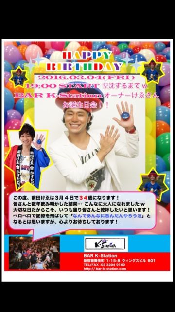 今年の3月4日で34歳になる前田さんと みんなで乾杯しましょということで お誕生日当日はBAR K-Stationで乾杯です。 3月4日(金) お誕生日会 19:00〜 新宿 歌舞伎町BAR K-Station https://www.facebook.com/events/584475645034050/ 宣伝動画 【URL】https://youtu.be/KCNHWtLf7CA 詳しくは前田さんのブログから http://ameblo.jp/ke-maeda/entry-12126809589.html もう参加することが決まっている方は イベントページから参加ボタン押してくださいね!