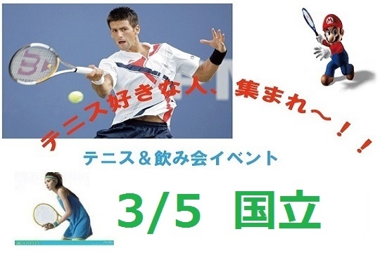管理人様、スペースをお借りします! 本気でやりたいテニスプレイヤーは遠慮してください(^^なんてことは言いませんが、ガツガツ打ち合いたい方には向かないかもしれません。 ゆっくりとテニスをして、その後立川駅近郊にて居酒屋で交流会を行います。 ※テニスと飲み会がセットです。現在、テニスのみの参加は受け付けてません。 最終的な男女比の調整はしませんが、男女の参加希望者のために当初の申込枠は男女半々とします。応募状況によってはどちらかを早期に締め切る場合もあります。 ※今回もコートが2面(※最初の1時間は