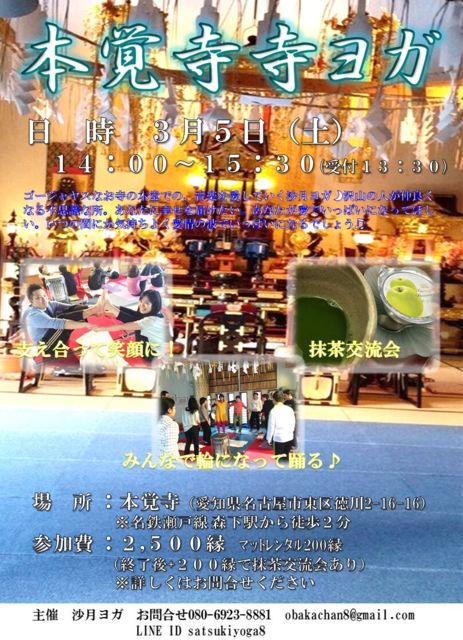 3月5日(土) 寺ヨガ(本覚寺) お寺の本堂を使わせてもらい、寺ヨガをおこないます。 肩こり、腰痛、自分を見つめることができる、気持ちを平穏にすることができる。優しい気持ちになることができます。 みんなが平和な気持ちになりますように☆ いっぱい、いっぱい自分を愛してほしい☆ そんな気持ちでお伝えしています♪ 初心者大歓迎ですので、初心者の方もお気軽にご参加くださいませ☆ 本堂で気持ちよく疲れを吹き飛ばしましょう(*^^*) 終わった後は、希望者だけ+200縁で1階の寺カフェでお茶(抹茶or紅茶)をいただいて仲良く交