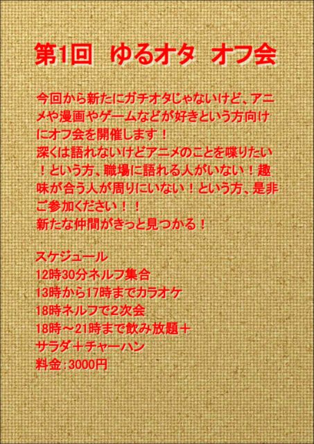 ゆるオタ向けのオフ会を開催します! 今回からのイベントになりますので参加しやすいです! お昼がカラオケで夜からBARネルフで二次会を行います! 詳細は画像を貼っておきますのでご確認下さい(*´ω`*)