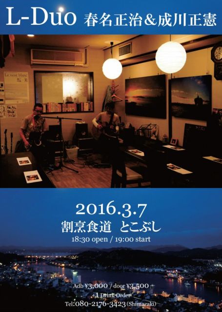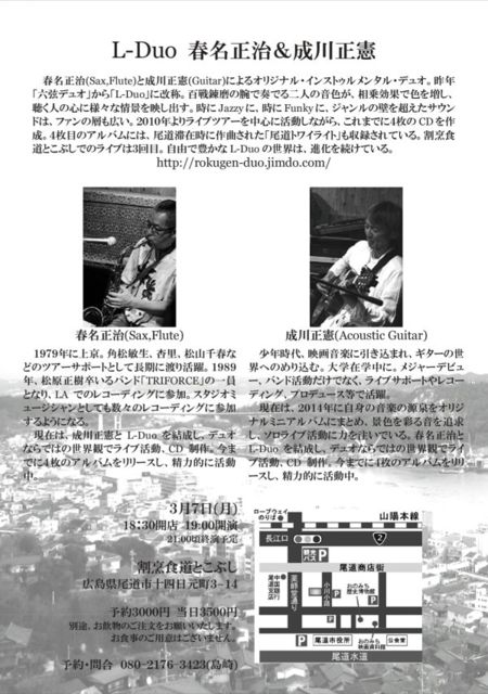 はじめまして。突然のイベント作成失礼いたします。 私事ですが、東高卒業後、尾道を離れて早25年。 お盆もお正月もろくに帰らないので、友人の行方も殆どわかりません。 そんな中、東京を中心に活動するミュージシャンさんから、 ぜひ尾道でライブやりたい!と言っていただき、 数少ないつてをたどって、どうにか企画しました。 L-Duo 春名正治&成川正憲 LIVE! http://rokugen-duo.jimdo.com/ 場所 : 割烹食道とこぶし 時間 : 18:30開場/19時開演 料金 : 予約3000円/当日3500円 (+飲み物代) アコースティックギターと、サ