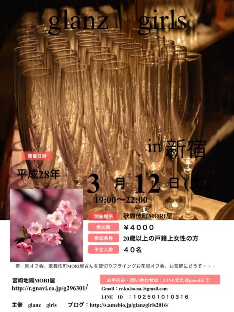 glanz girls初のオフ会 3/12(土)新宿にてフライングお花見オフ会 春を先取り?店内にてお花見オフ会。 美人オーナーさんご協力のもと初めての試みを実現。 温かくくつろぎの店内でお花見気分を味わいながら酔いしれませんか? 日時…3/12土曜日 時間…19:00-22:00 場所…新宿歌舞伎町にてお店を貸切 ご予約…gmailから、re.ko.ha.na.2015@gmail.com LINEやmixiからでも… 詳細はこちら… http://ameblo.jp/glanzgirls2016/entry-12126533737.html 主催glanz girlsサイト http://glanzgirls.web.fc2.com