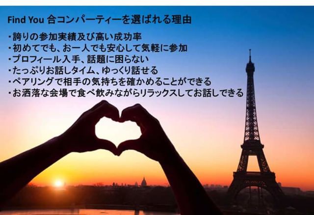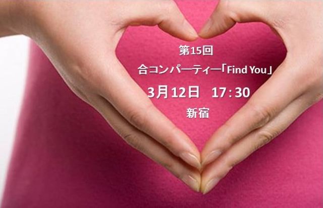 2016年3月12日に第15回「FindYou」合コンパーティーを開催いたします。 実名制、高カップリング率 初めの方、お一人でも安心で参加できます。 時間:2016年3月12日(土) 17:30〜20:30 場所:東京 新宿 (詳細は申し込み後に通知します。) 人数:MAX60名(バランスを調整致します。) 国籍:不問 参加条件:独身 料理: 食べ放題+飲み放題 料金: 5500円(税込み)(当日LINEを登録す場合、500円OFF) 申し込み専用フォーム: https://pro.form-mailer.jp/fms/28ad1e8691622 ホームページ:http://findyoujp.wix.com/home こ