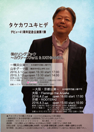 僕のソングブック 〜 カヴァーズpart1 & KATHMANDU 〜 会場 岩崎博物館 山手ゲーテ座ホール 時間 16:30開場 17:00開演 料金 6,500円 当日 7,000円 指定席 12月17日(木)よりアメニティ先行受付開始 http://www.mediatv.ne.jp/musicpro/takekawa/info/app_1603.html 1月中旬より一般発売 お問合せ アメニティ (TEL: 03-3334-7442/平日13:00〜18:00) 岩崎博物館 山手ゲーテ座ホール TEL048-829-2360 http://www.iwasaki.ac.jp/museum/pg248.html