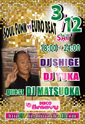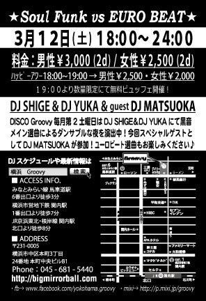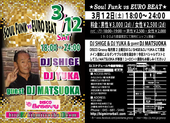DISCO Groovy 毎月第2土曜日は!【DJ SHIGE&DJ YUKA】にておなじみ黒音中心の踊れる夜を演出中♪ 今回は【DJ MATSUOKA】がGroovyの第2土曜に初登場しユーロビート選曲タイムもございます♪ 横浜ならではの《SOUL FUNK vs EUROBEAT Night》を皆様でどうぞお楽しみください★ 【音楽】 Soul、Funk、Dance Classics、R&B、Hip-Hop、EUROBEAT、etc... 【開催時間】 18:00〜24:00 【ハッピーアワー料金 / 18:00〜19:00にご来店の方】 男性:¥2,500/2Drinks+ビュッフェ付 女性:¥2,000/2Drinks+ビュッフェ付 【料金 / 19:00以降ご来