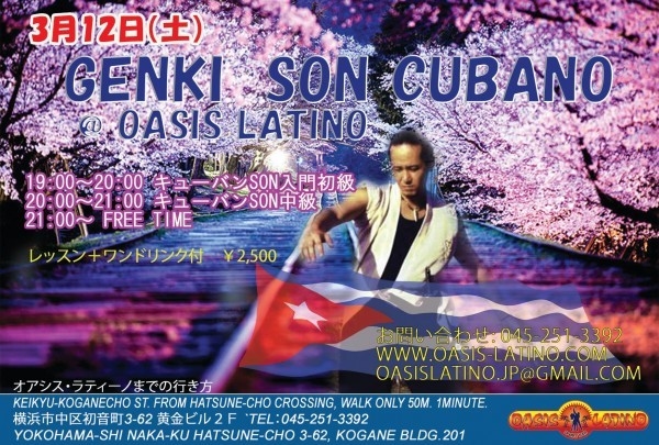 Genki SON Cubano @ Oasis Latino Cesar's Happy Birthday 3月12日 土曜日 18:30 - Open 19:00 - 20:00 キューバン SON 入門初級(ステップ) 20:00 - 21:00 キューバン SON 中級(ルティーン) 21:00 - 24:00 元貴 & しんちゃん DJ Time ¥2,500 w1D GENKI 鹿児島とキューバで大人気のキューバンサルサインストラクターが 横浜でレッスン DJ しんちゃん Yokohama Salsa OASIS LATINO - Salsa en Japon 横浜市中区初音町3-62 黄金ビル二階 045-251-3392 www.oasis-latino.com oasislatino.jp@gm
