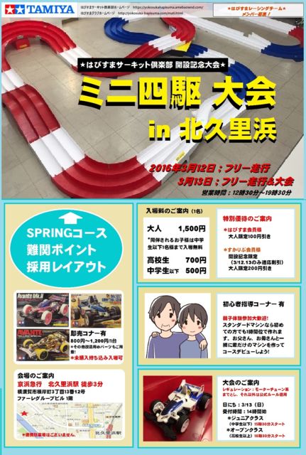 ★はぴすまサーキット倶楽部 開設記念大会★ ミニ四駆 大会 in 北久里浜 [はぴすまクラブ詳細HP] http://yokosuka-hapisuma.com/mati.html [はぴすまサーキット倶楽部HP] https://yokosukahapisuma.amebaownd.com/ 開催日 2016年 3月12・13日(土日) 12日:フリー走行 13日:フリー走行&大会 営業時間 12:30 〜 19:30 開催場所 京浜急行「北久里浜」駅徒歩3分 横須賀市根岸町3-13-12 ファーレグループビル1階 ※3月サーキットOPEN日 (3/12・13・19・27)