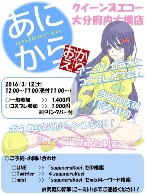 どーもです! こーえいです アニソン!コスプレ!オフ会! アニカラ3期のお知らせです! ◎日時 2016/3/12(土) 12:00〜17:00(受付は11:00〜) ※今までより1時間早く始めます! ◎会場 店舗 >> クイーンズエコー大分府内大橋店 住所 >> 大分県大分市宮崎五反田829-1 番号 >> 097-567-6535 http://www.queensecho.com/store/ohashi/ ◎会費 一般予約 >> 1,400円 コス参加 >> 1,000円 ○ドリンクバー付き ○途中参加・退出あり(会費は同額です) ※予約の会費を値上げしました ※今回は当日参加