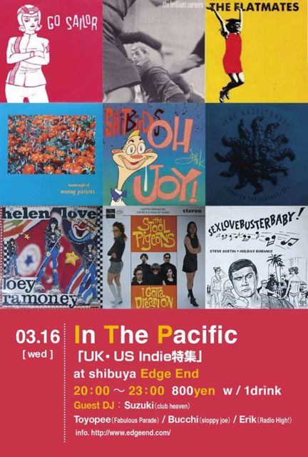 ¡ÚIn The Pacific 108 ¡Ý UK¡¦US Indie ¡Ý¡Û 2016/3/16 (Wed) ¡÷½ÂëEdge End http://www.edgeend.com/ 20:00¡Á23:00 800yen w/1d DJs: toyopee(fabulous parade /A Love Song) Ç¡·î¥¿¥¯¥ß(Erica) Bucchi(sloppy joe) ERIK(Radio High!) Guest DJ: Suzuki (club heaven) Á°²ó¤Î90ǯÂåÆÃ½¸¤ÇÀª¤¤¤Å¤¤¤¿¤«¡©º£·î¤ÏUK¡¦US Indie ¤ò¥Ô¥Ã¥¯¥¢¥Ã¥×¡ª ¥²¥¹¥È¤Ï¤ß¤ó¤ÊÂç¹¥¤¡¢¥Ø¥Ö¥ó¤Î¥¹¥º¥¤µ¤ó¤Ç¤¹¡ª ¤è¤í¤·¤¯¤ª´ê¤¤¤·¤Þ¤¹¢ö