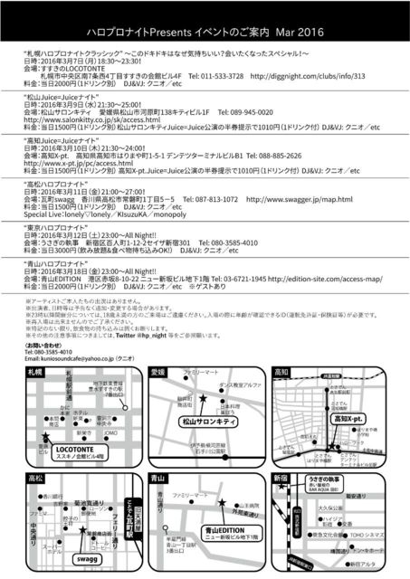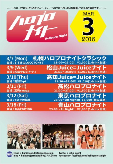 “青山ハロプロナイト” 〜オールジャンルにてひなフェス前夜祭!〜 日時:2016年3月18日(金)23:00〜All Night! 会場:青山EDITION 03-6721-1945 住所:港区赤坂8-10-22 ニュー新坂ビル地下1階 http://edition-site.com/access-map/ 地下鉄各線青山一丁目駅より徒歩で3分 地下鉄各線乃木坂駅より徒歩で3分 地下鉄各線六本木駅より徒歩で10分 料金:当日2000円(1ドリンク別途) DJ:クニオ/etc 映像制作:KASSY?/青迷彩/メルティーローズ/etc ☆出演者は予告なく追加・変更する場合があります。 【ハロプロナイトと
