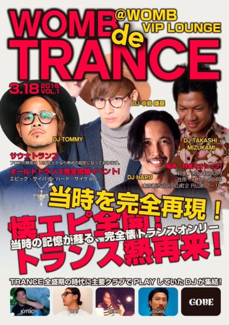 渋谷の巨大club「WOMB」にて 遂にTrance Partyが始動します。 今週金曜日に、新感覚TRANCE PARTY! 「de TRANCE」開催です。 第1回目ということでタイトル名も「WOMB de TRANCE」! 当時、Trance全盛期の頃に渋谷、六本木での人気clubで活躍した実力派DJ人が集結! この日は1回目ということもあり 懐かしいTRANCE中心に盛り上がり間違いなし!! 週末は1000人規模のWOMBでは 初のepic Tranceの開催です。 ディスカウント希望の方は事前に登録が必要です。 お名前「カタカナフルネーム+人数」をご連絡ください。 ======