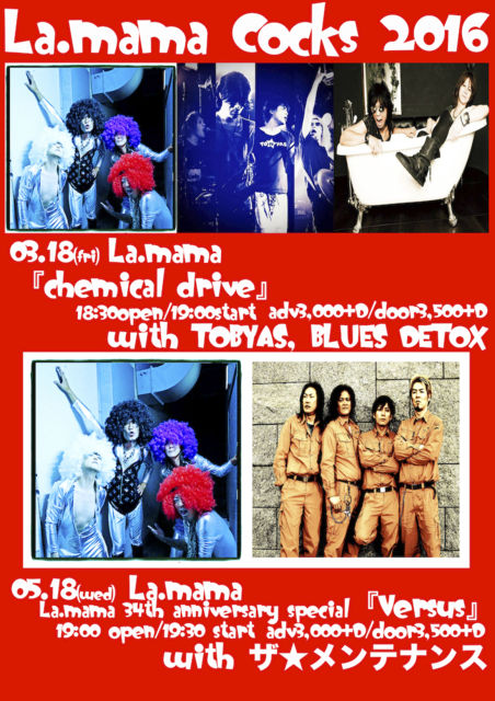 2016.03.18(fri) shibuya La.mama 03-3464-0801 『chemical drive』 18:30 open / 19:00 start adv3,000+d / door3,500+d La.mama Cocks, TOBYAS, BLUES DETOX