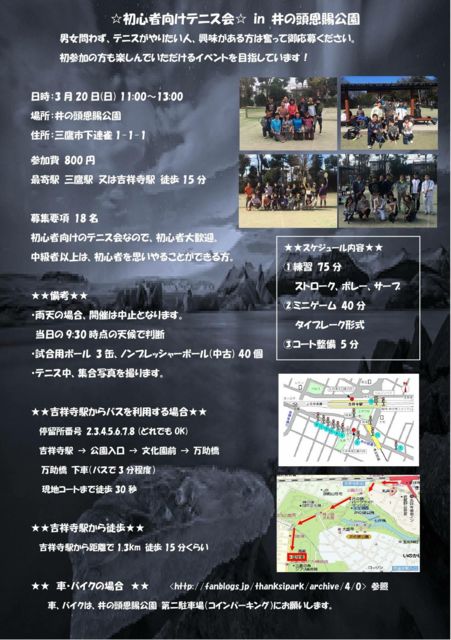 ÃȤ«¤¯¤Ê¤Ã¤Æ¤¤Þ¤·¤¿¡ª ¥Æ¥Ë¥¹¤Îµ¨Àá¤Ç¤¹¡£ ³§ÍÍ¡¢¤ªÍ¶¤¤¤Î¾å¡¢¤´»²²Ã¤¯¤À¤µ¤¤¡£ 3·î20Æü(Æü) 15:00-17:00 ¢¨±«Å·Ãæ»ß Äê°÷¡§ÃËÀ4̾¡¢½÷À4̾ ¥ì¥Ù¥ë¡§½éµé°Ê¾å ³«ºÅ¾ì½ê¡§±î¹¾²¸»ò¸ø±à¥Æ¥Ë¥¹¥³¡¼¥È ÅÔ±ÄÃϲ¼Å´¿·½ÉÀþ¡ÊS13¡Ë¡¦Åìµþ¥á¥È¥íȾ¢ÌçÀþ¡Ö½»µÈ¡×(Z12)²¼¼Ö £Á£³½Ð¸ý¡¡ÅÌÊâ2ʬ JRÁíÉðÀþ¡Ö¶Ó»åÄ®¡×Æî¸ý²¼¼Ö ÅÌÊâ15ʬ http://www.tokyo-park.or.jp/park/format/access013.html ½¸¹ç¾ì½ê¡§¥³¡¼¥È¤ËľÀܤª±Û¤·¤¯¤À¤µ¤¤ ½¸¹ç»þ´Ö¡§15:00 ¢¨¤³¤Á¤é¤Ë¥³¡¼¥ÈÈÖ¹æ¤ò½ñ¤¹þ¤ß¤Þ¤¹¡£ »²²ÃÈñÍÑ¡§500¡Á800±ß (¥³¡¼¥ÈÂå¡Ü¥Ü¡¼¥ë