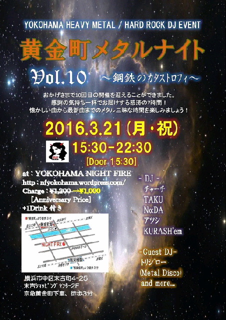 ²«¶âÄ®¥á¥¿¥ë¥Ê¥¤¥È Vol.10 ¡Ø¹ÝÅ´¤Î¥«¥¿¥¹¥È¥í¥Õ¥£¡Ù Æü»þ: 3·î21Æü¡Ê·î¡¦½ËÆü¿¶ÂØÆü¡Ë15:30¡Á22:30 Æþ¾ìÎÁ: ¡ï1000with 1¥É¥ê¥ó¥¯ ²ñ¾ì: ²£Éͥʥ¤¥È¥Õ¥¡¥¤¥ä¡¼ DJs: Ž¥¥Á¥ã¡¼¥Á Ž¥TAKU Ž¥No:DA Ž¥¥¢¥Ä¥· Ž¥KURASH'em Guest DJ: Ž¥¥È¥ê¥¸¥í¡¼¡ÊMetal Disco¡Ë Ž¥¡ß¡ß¡ß¡ß¡ß¥ó¢«½Ð±é¸ò¾ÄÃæ¡ª Á°²ó³«ºÅ¤è¤ê8¥ö·îޥޥ Ëþ¤ò»ý¤·¤Æ¤ÎÂ裱£°²ó³«ºÅ·èÄꡪ 3/21¡Ê·î¡¦½ËÆü¿¶ÂØÆü¡Ë15:30¡Á22:30 ÅÜÅó¤Î£·»þ´Ö¡¢¥á¥¿¥ë»°Ë桪 º£²ó¤Ï10²ó³«ºÅµÇ°¤È¤·¤ÆÆþ¾ìÎÁ¤ò¡ï1200¢ª¡ï1000¡Ê1¥É¥ê¥ó¥¯ÉÕ¤¡Ë¤Ë½Ð·ìÂ祵¡¼¥Ó¥¹¡ª Ž¥Íè¾ì¼ÔÁ´°÷¤ËDJ¿ØÁª¶Ê