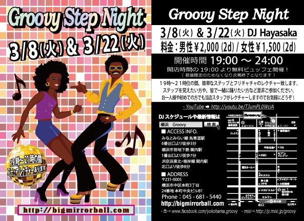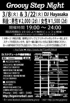 Âè2¡¦Âè4¤Î²ÐÍËÆü¤Ï¡ÚGroovy STEP NIGHT¡Û19»þ¡Á21»þ°Ì¤Î´Ö¡¢´Êñ¤Ê¥¹¥Æ¥Ã¥×¤È¥Õ¥ê¥Á¥ã¥Á¥ã¤Î¥ì¥¯¥Á¥ã¡¼¤¢¤ê¤Þ¤¹¡ª ½é¿´¼Ô¤ÎÊý¡¢¤ª°ì¿ÍÍͤǤ⡢ÅöŹ¥¹¥¿¥Ã¥Õ¤¬¤´Âбþ¤µ¤»¤ÆÄº¤¤Þ¤¹¤Î¤Ç¤É¤¦¤¾¤ªµ¤·Ú¤Ë¤´»²²Ã¤¯¤À¤µ¤¤¢ö ¡ÚDJ¡ÛHayasaka ¡Ú²»³Ú¡ÛALL MIX ¡Ê21»þ°Ì¤«¤é¤ÏÄ̾ï¤ÎDISCO TIME¤Ë¤Ê¤ê¤Þ¤¹¡£¥ê¥¯¥¨¥¹¥È¤Ë¤â½ÐÍè¤ë¸Â¤ê¤ª±þ¤¨¤¤¤¿¤·¤Þ¤¹¤Î¤ÇDJ¤Þ¤Ç¤É¤¦¤¾¢ö¡Ë ¡Ú³«ºÅ»þ´Ö¡Û 19:00¡Á24:00 ¡ÚÎÁ¶â¡Û ÃËÀ¡§¡ï2,000/2Drinks¡Ü¥Ó¥å¥Ã¥Õ¥§ ½÷À¡§¡ï1,500/2Drinks¡Ü¥Ó¥å¥Ã¥Õ¥§ ¡Ê¥Ó¥å¥Ã¥Õ¥§¤Ï19»þ¤è¤ê¤´ÍѰÕÃפ·¤Þ¤¹¤¬¿ôÎ̸ÂÄê¤Î¤¿¤á