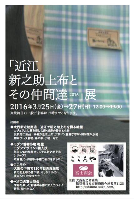 【日時】2016年3月25日(金)〜3月27日(日) 12:00〜19:00 (「玉川奈々幅&沢村豊子 浪曲」公演イベント開催のため 27日は一般入場17:00) 今年は濃縮、3日間!大西新之助商店最大のお祭り! 新之助上布を愛する若いクリエイターの仲間たちと、ギャラリーしあんに集います! 職人大西實も皆様との出会いをとても楽しみにしています。 新之助上布とのコラボレーション商品中心に自慢の商品をを持ち寄り集います。 「 新之助上布×若いクリエイター」はここでお披露目の商品もいろいろ! ★新之助上布も、新之