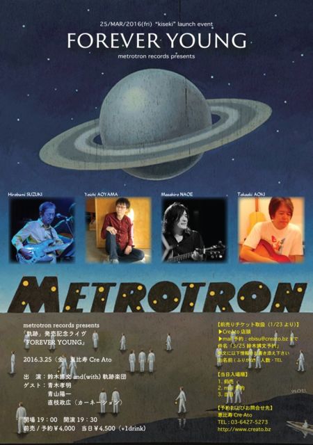 3月25日(金) 東京都 恵比寿 CreAto http://www.creato.bz/schedule/events/index.html?r=306 「metrotron records presents 「軌跡」発売記念ライヴ 『Forever young』 」 出演:鈴木博文(ムーンライダーズ) and 軌跡楽団 ゲスト青木孝明/青山陽一/直枝政広(CARNATION) open19:00 start19:30 前売り4000円 当日4500円 共に+1DRINK metrotron records → http://metrotron-records.com/ 所謂「軌跡」のレコ発的ライブではありますが、 私とゲスト、ステージ全員の最も新しい姿とこれからを お見せするひとときとなるは
