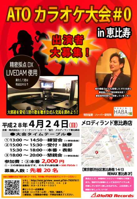 皆様大変お待たせいたしました 約10年ぶりに、管理人がカラオケイベントを担当させていただきます 今回は、私の努めているAtoNORecords(エートゥーナンバーレコード)主催のカラオケ大会になります 提携しているカラオケ店(メロディランド恵比寿店)様にもご協力いただき、低価格で気軽に楽しめるイベントが実現しました。 音楽好きな方でしたら、初心者から上級者、老若男女どなたでも結構です。 特に下記の内容に少しでも当てはまる方は、是非是非お気軽にご参加くださいね ●特にこんな