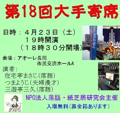 4月23日土曜日19時開演「第18回大手寄席」です。 会場は、アオーレ長岡市民交流ホールA 出演は、 在宅亭まさじ(落語) つまようじ(夫婦漫才) 三遊亭三久(落語) 入場無料。 よろしくお願いします。