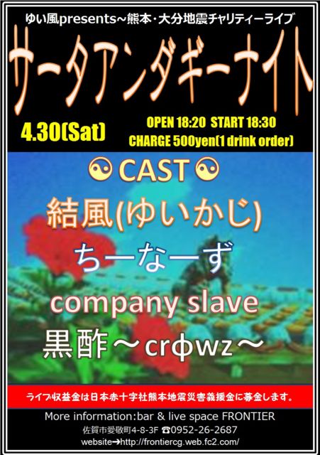 さて、コミュ上で告知していたゆい風企画のフロンティアライブ「サータアンダギーナイト」ですが、 私以外でも3バンドでテフテフの皆さんが出演されるので、ライブ後の打ち上げに参加したい、ただ飲みたい、という方がいたらこのコミュに書き込み下さい。 飲み代はアルコールとノンアルコールの人に分けて、頭割りしたいと思います。 今のところ参加者は、井上君、みずほ君、貴行さん、ぐっさんとそのバンドの若者3名、ともっち、けい君、ゆい風の古川さんと私の11人です。もちろん女性もどうぞ。