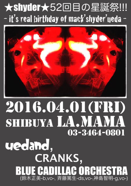 2016.04.01(fri) shibuya La.mama 03-3464-0801 ¡ùshyder¡ù52²óÌܤÎÀ±Ãº×!!! -it's real birthday of mack 'shyder' ueda- 18:30 open / 19:00 start adv3,000+d / door3,500+d uedand, CRANKS, BLUE CADILLAC ORCHESTRA(ÎëÌÚÀµÈþ-vo,b-, ÀÆÆ£ÆÆÀ¸-ds,vo-, ¿ÀÅçÃÒÌÀ-g,vo-)