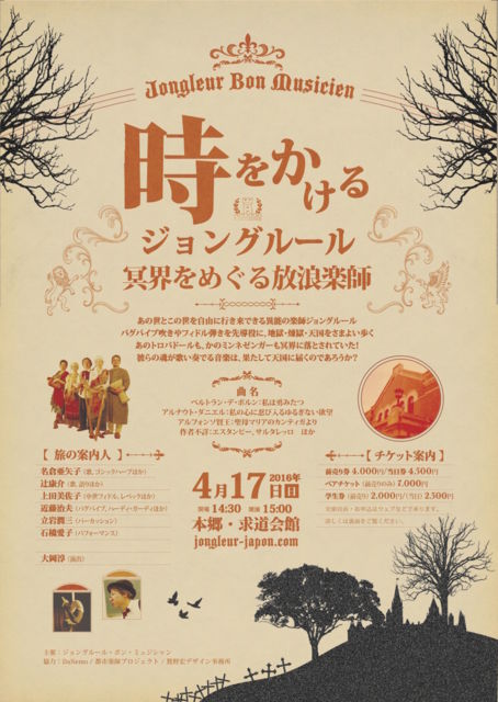 今回の公演は、ダンテの「神曲」をモチーフに、放浪楽師ジョングルールが皆さんを冥界めぐりの旅にご案内します。 4月17日(日)ジョングルール・ボン・ミュジシャン「時をかけるジョングルール---冥界をめぐる放浪楽師」 本郷:求道会館(東京都文京区本郷6−20−5) 開演:15時(開場14時30分) 料金:当日4500円(前売り4000円)、学生当日2500円(前売り2000円)、ペア席7000円(前売りのみ) 出演:名倉亜矢子(歌、ゴシックハープ)、辻康介(歌、語り)、上田美佐子(中世フィドル他)、近藤治夫(バグ