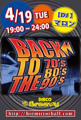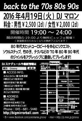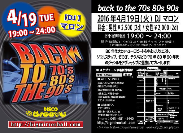 第1回 back to the70s 80s90s 横浜 Groovyでイベント開催します 4月19日火曜日19時から24時まで 念願の横浜で開催します 80年代大ヒットユーロビートを中心にリクエスト、ソウルステップ 竹の子 テクノなどの70年80年90年代のジャンルを 5時間休まずアグレッシブに選曲してプレイします! 踊り倒して汗だくなっていただきます! ◎男性2500円(2d)女性2000円(2d) DJは私マロンがPLAYします!