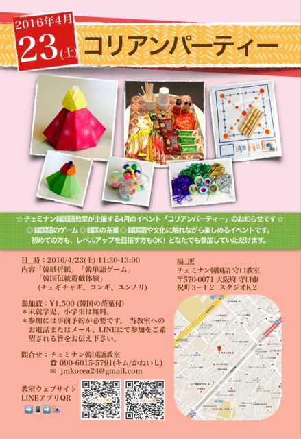 ¡ù ¥Á¥§¥ß¥Ê¥ó´Ú¹ñ¸ì¶µ¼¼¤¬¼çºÅ¤¹¤ë4·î¤Î¥¤¥Ù¥ó¥È ¡Ö¥³¥ê¥¢¥ó¥Ñ¡¼¥Æ¥£¡¼¡×¤Î¤ªÃΤ餻¤Ç¤¹ ¡ù http://jmkorea24.blogspot.jp/2016/04/blog-post_0.html ¡ý ´Ú»æÀÞ¤ê»æ ¡ý ¡ý ÅÁÅýÍ·µºÂθ³ ¡ý ¡ý ´Ú¹ñ¸ì¤Î¥²¡¼¥à ¡ý ¡ý ´Ú¹ñ¤ÎÃã²Û ¡ý ´Ú¹ñ¸ì¤äʸ²½¤Ë¿¨¤ì¤Ê¤¬¤é³Ú¤·¤á¤ë¥¤¥Ù¥ó¥È¤Ç¤¹¡£ ½é¤á¤Æ¤ÎÊý¤â¡¢¥ì¥Ù¥ë¥¢¥Ã¥×¤òÌܻؤ¹Êý¤âOK ! ¤É¤Ê¤¿¤Ç¤â»²²Ã¤·¤Æ¤¤¤¿¤À¤±¤Þ¤¹¡£ Æü »þ¡§2016/4/23(ÅÚ) 11:30-13:00 ÆâÍÆ¡Ö´Ú¹ñÀÞ»æ¡×¡Ö´Úñ¸ì¥²¡¼¥à¡× ¡Ö ´Ú¹ñÅÁÅýÍ·µºÂθ³¡× (¥Á¥§¥®¥Á¥ã¥®¡¢¥³¥ó¥®¡¢¥æ¥ó¥Î¥ê) ¾ì ½ê ¥Á¥§¥ß