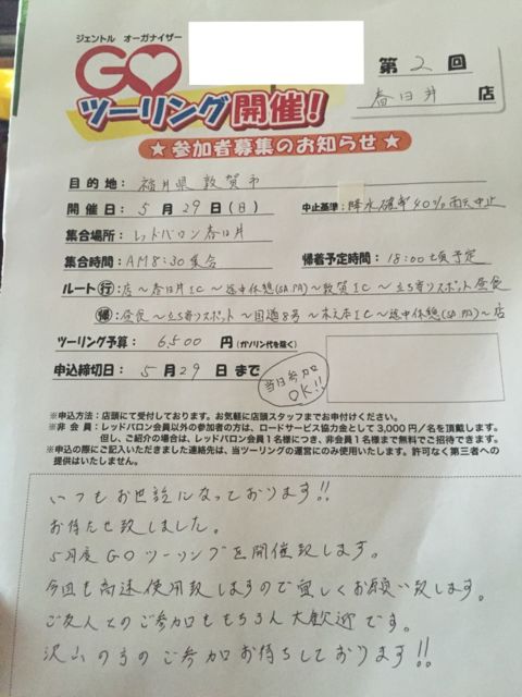 皆さんこんにちは GWはいかがお過ごしでしょうか?(^_^) 今月のGOツーリングの開催日のお知らせです! 5月29日日曜日にツーリング開催致します(^人^) 今回の行き先は、福井県敦賀市へ行きます! 詳細はGOツーリング開催のお知らせをご覧ください。