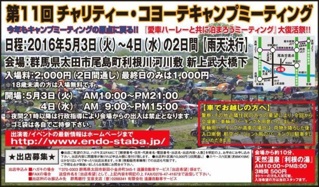おかげさまで11回目を迎えることができました。 今年も昨年同様2日間開催となりましたが3日にテント張って4日に撤去じゃ なんとなく、のんびりできないな〜とか、ちょっと仲間とのプライベート感で参加したいな〜。 4日仕事で3日しか参加できないが日帰りじゃ…みたいな参加者の為に「勝手に前夜祭」 と名づけ、2日より入場OKとさせていただきます。 イベント等も無く出店もまだ準備中で只単にスタッフが居るってだけの2日の夜ですが そんな半プラキャン状態でも楽しんじゃいましょう。 もちろん、早く入ったからって追加料金等はかかりませ