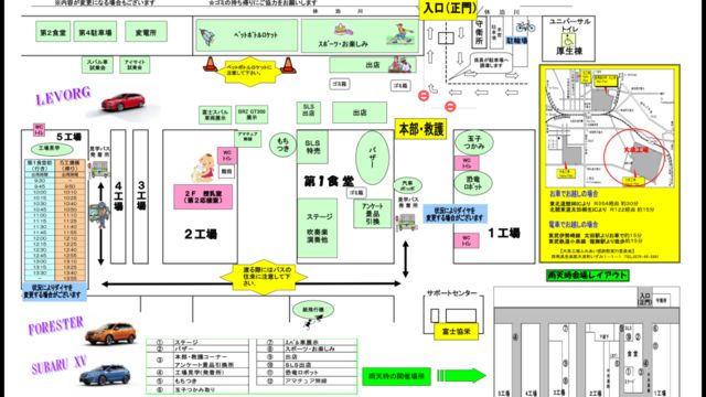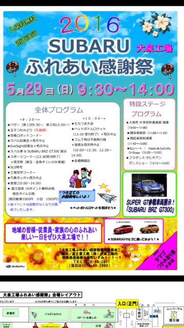 2016年 ふれあい感謝祭 大泉工場 日時 5月29日 9:00〜14:00 場所 群馬県邑楽郡大泉町いずみ1−1−1 富士重工業株式会社 大泉工場 今年もこの時期がやってきました。 大泉工場ふれあい感謝祭。 私は初めて行くのですが、ステラで行く方いますか? もし人数等集まるようでしたら近くの公園に集合し、並んで会場入りしようかなと考えてますが、如何でしょうか? 何分新参者です、何分来週末ですので。 一緒に行かれる方、宜しくお願いいたします。 ご意見等ありましたら何なりと、言っていただけたらと思います。