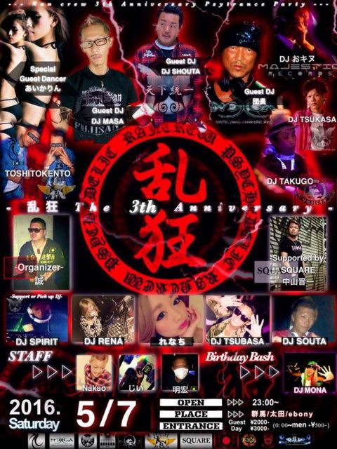 https://www.facebook.com/events/136193253449579/ 5月7日(土)太田EBONY 乱狂 3th anniversary ALL PSYCHEDELIC PARTY http://ameblo.jp/trancefamily/entry-12152349676.html OPEN 23:00〜 ■入場料 当日 ¥3,000 DISCOUNT ¥2,000 (12時以降に入場の男性+500円) 受付で団長のゲストと言って頂ければ ディスカウント料金になります。 ■SPECIAL GUEST DANCER あいかりん ■GUEST DJ 団長 (K-HOLE/NOGA RECORDS) http://souljapan.jp/articles/sWLcq SHOUTA (K-HOLE/天下統一) MASA (