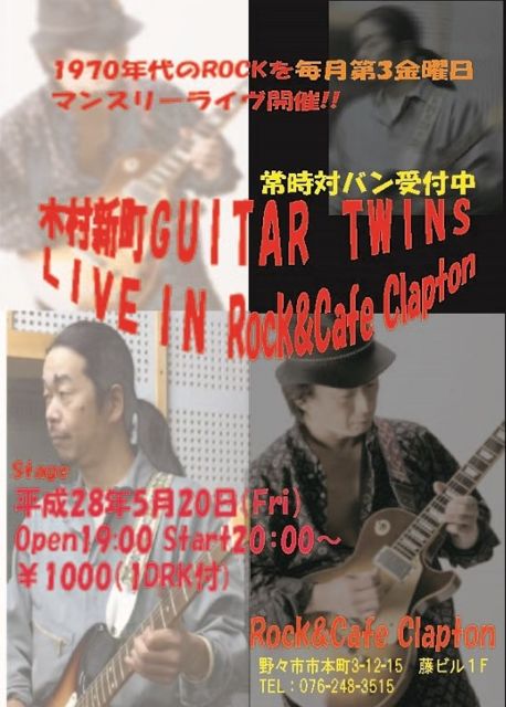 5月20日(金) 19:00オープン 20:00スタート 『 木村新町GUITAR TWINS LIVE in CLAPTON 』 1970年代のROCKを!! 心に響くBLUESを!! 毎月第3金曜日マンスリーLIVE開催!! 常時対バン募集中 ミュージックチャージ 1,000円(ワンドリンク付)