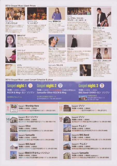 5/9〜15に金沢市周辺で北陸初のゴスペルミュージックウィークが開催されます! ゴスペルのラフォルジュルネを狙ってます(笑) GW明けは、ゴスペルミュージックウィークで♪ 宜しくお願いします〜!! ☆ゴスペルミュージックウィーク スケジュール☆ 5/9(月) ☆コンサート1☆ 19:00(18:30開場)入場無料 ♪ワーシップヒア 石川県教育会館 金沢市香林坊1-2-40 Tel.076-222-1241 (内容に関するお問い合わせはご遠慮ください) 5/12(木) ☆コンサート2☆ 14:30(14:00開場)入場無料 ♪ジソン