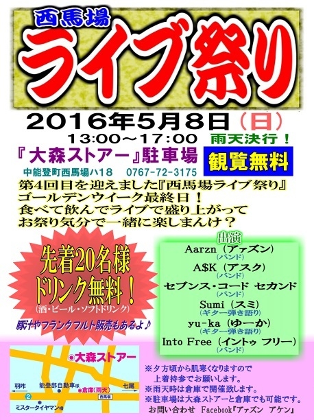 早いもので第4回目を迎えます。 お祭り気分で是非お越しくださいませm(__)m 【日時】2016年5月8日(日) 13:00〜17:00 【場所】大森ストアー 駐車場 石川県鹿島郡中能登町西馬場ハ18 0767-72-3175 【出演】 Aarzn セブンス・コード セカンド yu-ka A$K Into Free Sumi 舞 【料金】観覧無料 ※雨天時は倉庫で開催致します。