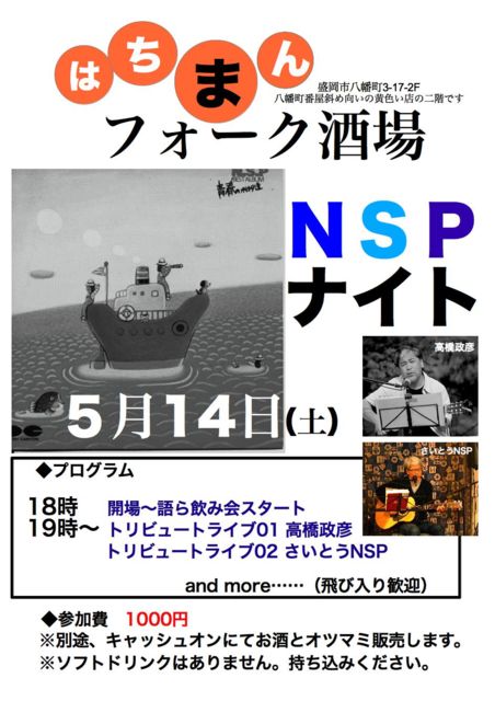 トリビュートライブを中心としたNSPラブな人たちの集いの夜です。 決定している出演者は、高橋政彦、さいとうNSPの二人ですが 当日飛び入りOKでさらに出演してくれる方々を募集中です。 予約の必要はありません。 入場料1000円 酒場なのでアルコール販売はしていますが ソフトドリンクは無いので持ち込んでください。