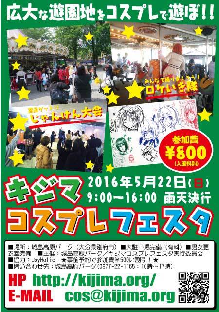 九州最大級のリゾート遊園地「城島高原パーク」でコスプレ! 撮るもよし! 遊ぶもよし! 友達を作るもよし! 遊園地を満喫しよう!! 日時:2016年5月22日(日) 09:00〜16:00(17時閉園) 参加費:¥800(ネット受付された方は¥500)※入園料別 場所:城島高原パーク(大分県別府市 阿蘇くじゅう国立公園内) 受付:イベントハウス(園内中心部) ※男女更衣室もこちらです 主催:キジマコスプレフェスタ実行委員会(運営:ジョイホリック) 男女更衣室あり。駐車場あり(有料) 屋内ホール及び遊園地全域でお楽しみいただけます。