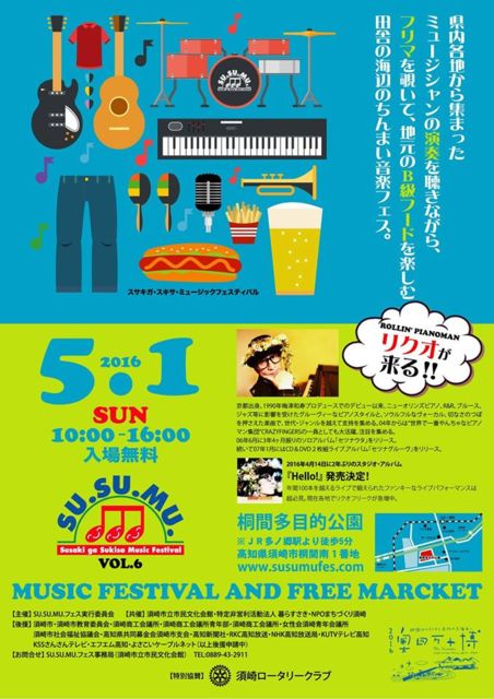 両足で自作のフットパーカッションを踏みながらのヘンテコなギター弾きの 管理人Jinでございます。 このコミュご参加の中に四国在住の方がどれくらいおられるかはわかりませんが紹介させて頂きます。 Susaki ga Sukisa Music Festival 2016 がGWに行われます。 二つのステージで計18組のミュージシャンに加えて プロゲストとしてリクオさんのライブもあります。 そしてB級グルメにフリーマーケットとお楽しみも満載のイベントです。 詳しくは以下URLに http://www.susumufes.com/html/time%20table2016.htm 私もお昼前後にちょ