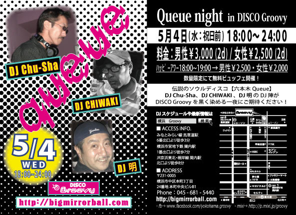 ¡Ú DISCO Groovy ¤Ë¤ÆÂ裲²óÌܳ«ºÅ¤Î¥¤¥Ù¥ó¥È¡ª¡Û ÅÁÀâ¤Î SOUL DISCO¡ÚÏ»ËÜÌÚ Queue¡Û¤¢¤Î¼¿¹õ¤ÎÌ뤬²£ÉͤˤƺƸ½¤µ¤ì¤ë°ìÌë¤Ë¤´´üÂÔ¤¯¤À¤µ¤¤¡ª ¡Ú²»³Ú¡Û FUNK¡¢SOUL¡¢Dance Classics¡¢Old School Hip-Hop¡¢etc... ¡Ú³«ºÅ»þ´Ö¡Û 18:00¡Á24:00 ¡Ú¥Ï¥Ã¥Ô¡¼¥¢¥ï¡¼ÎÁ¶â / 18:00¡Á19:00¤Ë¤´ÍèŹ¤ÎÊý¡Û ÃËÀ¡§¡ï2,500/2Drinks¡Ü¥Ó¥å¥Ã¥Õ¥§ÉÕ ½÷À¡§¡ï2,000/2Drinks¡Ü¥Ó¥å¥Ã¥Õ¥§ÉÕ ¡ÚÎÁ¶â / 19:00°Ê¹ß¤´ÍèŹ¤ÎÊý¡Û ÃËÀ¡§¡ï3,000/2Drinks¡Ü¥Ó¥å¥Ã¥Õ¥§ÉÕ ½÷À¡§¡ï2,500/2Drinks¡Ü¥Ó¥å¥Ã¥Õ¥§ÉÕ ¡Ê¥Ó¥å¥Ã¥Õ¥§¤Ï¿ôÎ̸ÂÄê¤Î¤¿¤á̵¤¯¤Ê¤ê¤·