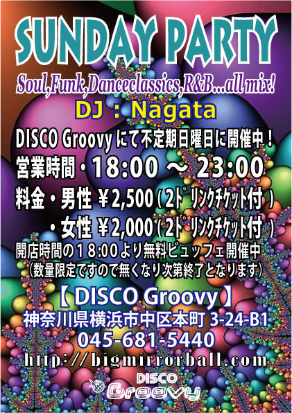 【DISCO GroovyのSUNDAY PARTY!】5月の第2日曜日:ゴールデンウィーク最終日はVDJ Nagataが担当いたします♪ SOUL、FUNK、DANCE CLASSICS、80'sポップスから最新HIT曲までMusic Videoを織り交ぜつつかけまくり!リクエストにも出来る限りお応えしますのでVDJまでお気軽にどうぞ☆ 【音楽】 ALL MIX 【開催時間】 18:00〜23:00 【料金】 男性:¥2,500/2Drinks+ビュッフェ 女性:¥2,000/2Drinks+ビュッフェ (ビュッフェは数量限定のため無くなり次第終了となります。ご了承ください。) 【VDJ】Nagata