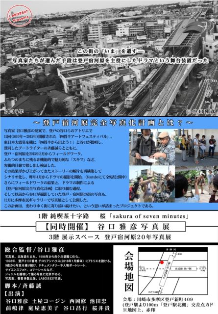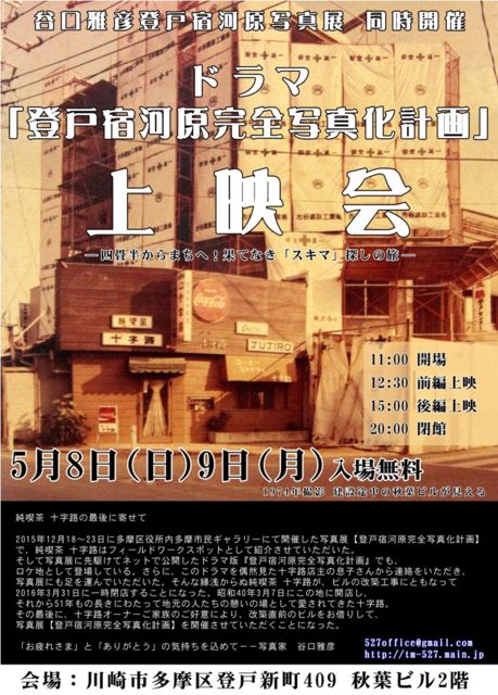 ドラマ「登戸宿河原完全写真化計画」上映会 同時開催:谷口雅彦登戸宿河原写真展 会期:5月8日(日)、9日(月) 入場無料 会場:神奈川県川崎市多摩区登戸新町409秋葉ビル2階 アクセス:小田急線、JR南武線「登戸駅」から100m 「登戸駅北側」交差点カド ●タイムテーブル 11:00開場 12:30前編上映 15:00後編上映 20:00閉館 総合監督:谷口雅彦 脚本:斉藤誠 出演:谷口雅彦、土屋コージン、西岡修、池田忠、前嶋律、庭屋恵美子、谷口昌行、桜井貴 【同時開催】谷口雅彦登戸宿河原写真展 1階 純喫茶十