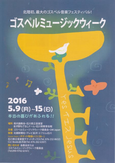 5/9〜15に金沢市周辺で北陸初のゴスペルミュージックウィークが開催されます! ゴスペルのラフォルジュルネを狙ってます(笑) GW明けは、ゴスペルミュージックウィークで♪ 宜しくお願いします〜!! ☆ゴスペルミュージックウィーク スケジュール☆ 5/9(月) ☆コンサート1☆ 19:00(18:30開場)入場無料 ♪ワーシップヒア 石川県教育会館 金沢市香林坊1-2-40 Tel.076-222-1241 (内容に関するお問い合わせはご遠慮ください) 5/12(木) ☆コンサート2☆ 14:30(14:00開場)入場無料 ♪ジソン
