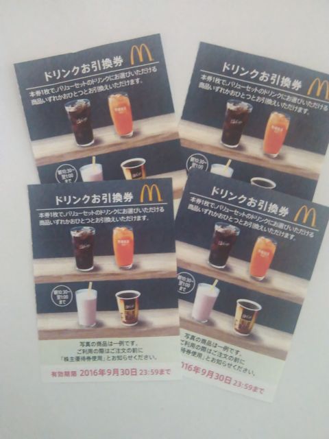 こちらはマクドナルドでドリンク類と交換できるチケットになります 炭酸類.爽健美茶.ミニッツメイド.野菜生活100.プレミアムローストコーヒー.カフェモカ.キャラメルラテなどのコーヒー類.シェイクと引換えできます S.M.Lの好きなサイズを選べますが、コーヒー類はS.Mのどちらかになります メッセージではなくコメントのみの挙手をお願いします 4枚まとめて1名様にお譲りします 普通郵便での発送になりすが送料無料です コメントのどこかに誰が引換え券を使う予定なのかを書いてください