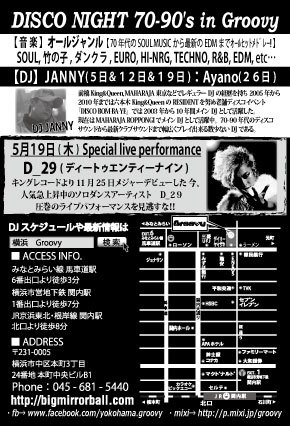 【毎週木曜日は!おなじみGroovyのディスコナイト】 70年代のSOULミュージックから最新のEDMまでオールヒットメドレー!踊れる曲盛り沢山でお贈りします♬ 【Organized By DISCO Groovy】 【DJ】 JANNY(MAHARAJA ROPPONGI) 【音楽】ALL GENRE (SOUL、竹の子、ダンクラ、EURO、HI-NRG、TECHNO、R&B、EDM、etc…) 【開催時間】 19:00〜24:00 【料金】 男性:¥2,500/2Drinks+ビュッフェ付 女性:¥2,000/2Drinks+ビュッフェ付 (ビュッフェは19時よりご用意しますが数量限定につき無くなり次第終了となります)