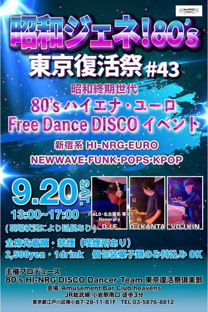 https://www.youtube.com/@HI-NRGDancerFUMI-te7lx ¥Ç¥£¥¹¥³¡¦¥¤¥Ù¥ó¥È¡ÖSHOWA Telophase Generation¡×¾¼ÏÂ¥¸¥§¥Í¡ª80¡Çs ÅìµþÉü³èº×¤òËè·îÂè3ÅÚÍËÃë13:00〜17:00(¾õ¶·¤Ë¤è¤ê±äŤ¢¤ê)¤Þ¤Ç¡¢ÅìµþÅÔ¹¾¸ÍÀî¶èÆî¾®´ä7-28-11¡¢JRÁíÉðÀþ(ºë¶ÌÊýÌ̤«¤é¤Ï½©ÍÕ¸¶¾è´¹¤¬ÊØÍø¡Ë¾®´ä±ØÆî¸ýÅÌÊâ3ʬ¡¢¥Õ¥¡¡¼¥¹¥È¥»¥ó¥È¥é¥ë¥Ó¥ëÃϲ¼1³¬¡¡Amusement Bar Club heavens ¥Ø¥Ö¥ó¥¹¤Ë¤Æ³«ºÅ¤·¤Þ¤¹¡£ DJôÅö¤Ï¡¢Åö¥¤¥Ù¥ó¥È¤ÎHonorary DJ F »á¡¢¥¢¥Ê¥í¥°DJ KANTA »á¤È¡¢VDJ KIN »á¤Ç¤¹¡£ ¥Ç¥£¥¹¥³¥¸¥ã¥ó¥ë¤Ï80ǯÂå¤Î¥Ï¥¤¥¨¥Ê¡¦¥æ¡¼¥í¡¦¥¤¥¿¥í¡¦¥Ë¥å¡¼¥¦¥§¡¼¥Ö