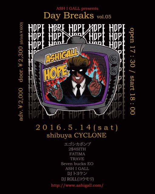 自主企画です!ヤベーバンドいっぱい揃えました! 【チケット代】 前売¥2000/当日¥2300 + 1d 18:00〜1.エゴシカボンブ 18:30〜2.2$4SITH 19:10〜3.FATIMA 19:50〜4.TRAVE 20:30〜5.Seven bucks EO 21:10〜6.ASHIGALL 22:00終了(写真撮影) 22:30中打ち開始 24:00完全撤収 転換DJ トヨケン ROLL(コウモリ) 中打ち希望の方は、参加費ひとり\1000で2drink+スナックつまみ O.Aから全力で暴れてってください!! 震えて待て!!! *ライブハウスにて熊本への支援物資を受付けたいと思っております! お預かりした物資