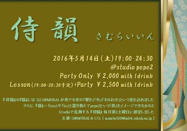 Studio Pepe2で乱舞する DJ S@MURAIオーガナイズイベント『侍韻』、 今月、5月は14日(土) 開催です。 好評頂いている「Cha Cha Cha」のレッスンにはDJ S@MURAIも参加し、 曲の紹介や解説など、音楽的側面から「Cha Cha Cha」に興味を持って もらえるようにと考えています。 今月のレッスンは、MITSUE先生にお願いしました! 『侍韻』の『韻』にはS@MURAIが奏でる音の「響き」「色」「おもむき」 という意を込めました さらに 『韻』=「inn」や「in」と置き換えてpepe2という「処」を イメージできるかなと Studioで乱舞す